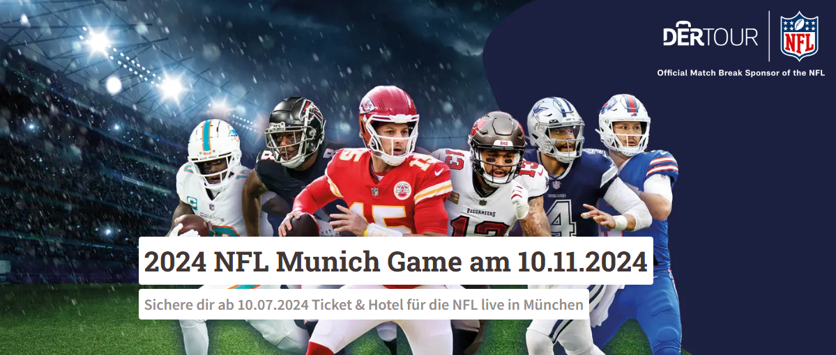 DERTOUR wurde von der NFL als offizieller Match Break Partner in Deutschland ausgewählt. Das bedeutet, dass ihr bei DERTOUR für alle Spiele zwischen 2022 und 2025 in Deutschland exklusive Reisepakete buchen könnt. Im Paket enthalten sind zum einen der Ticketpreis für das NFL-Spiel sowie ein oder zwei Übernachtungen in ausgewählten Hotels.