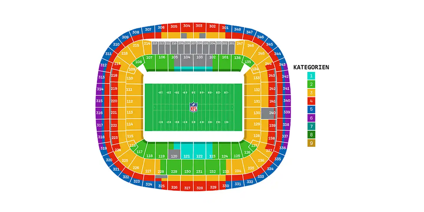Zwei Übernachtungen in einem unserer ausgewählten Münchener Hotels, Betreuung durch die DERTOUR Reiseleitung und am 10.11. eine Top-Übersicht von den Plätzen im Rang aus (siehe Sitzplan unten) – was will das Herz eines echten Football-Fans mehr?